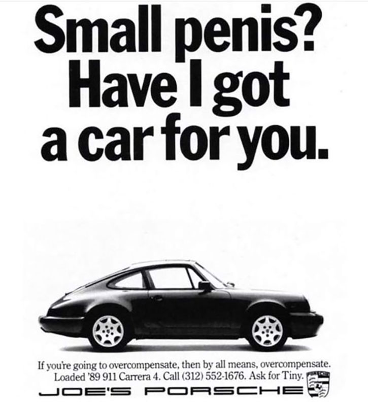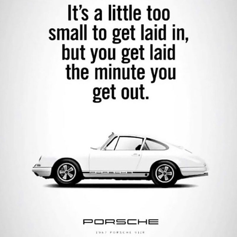 Porsche is a frequent flyer in the area of naughty advertising, which is kind of ironic because their hornier ads are frequently distributed among some of the more clever, creative ads of the era. It’s like the creatives were all, “Clever, clever, clever… grr, clever… cleverHORNDOG, MUST HORNDOG, MUST MAKE ONE ABOUT BLOWJOBS, ahhhh. Clever.”